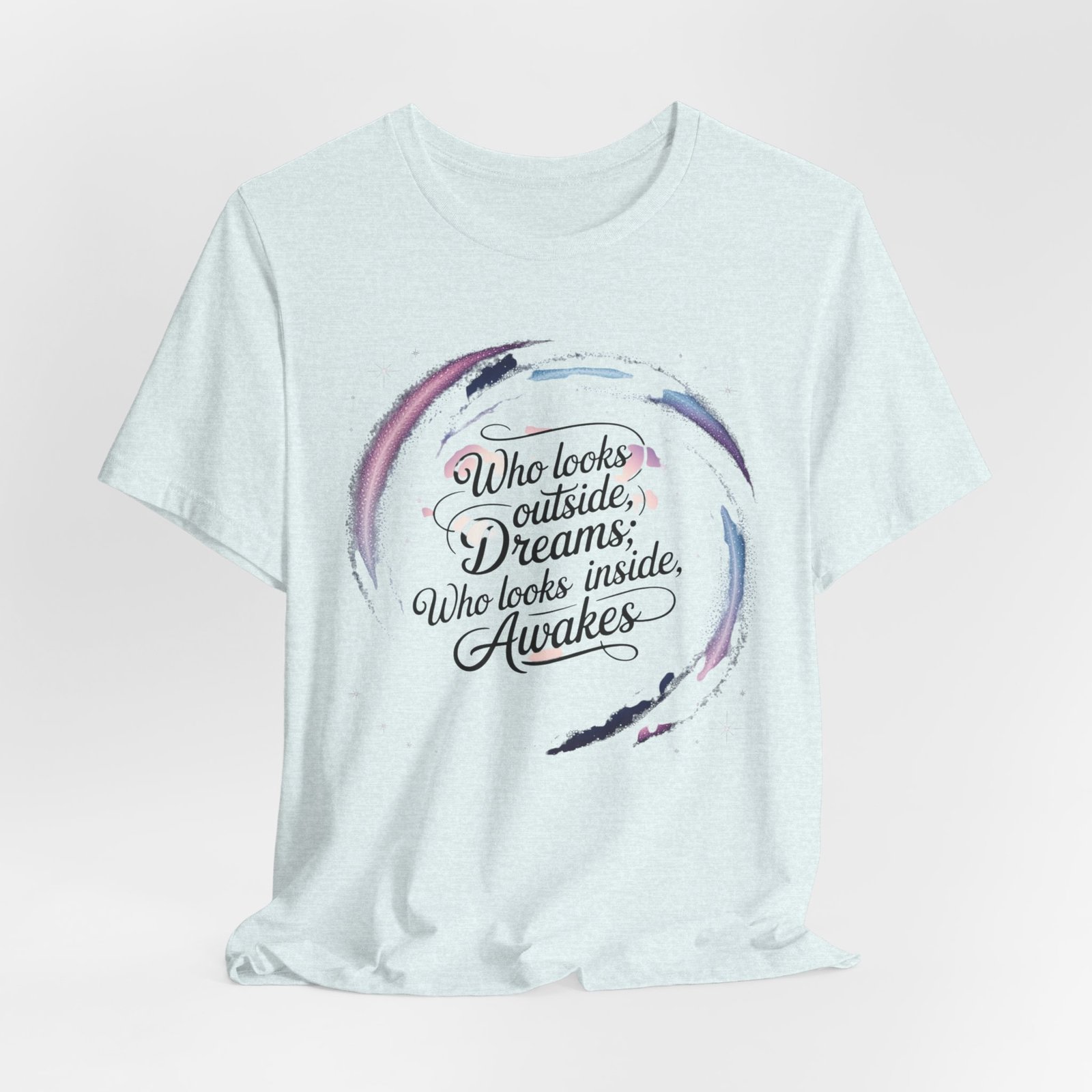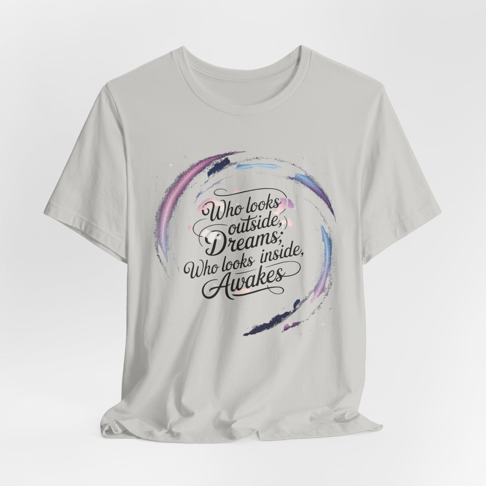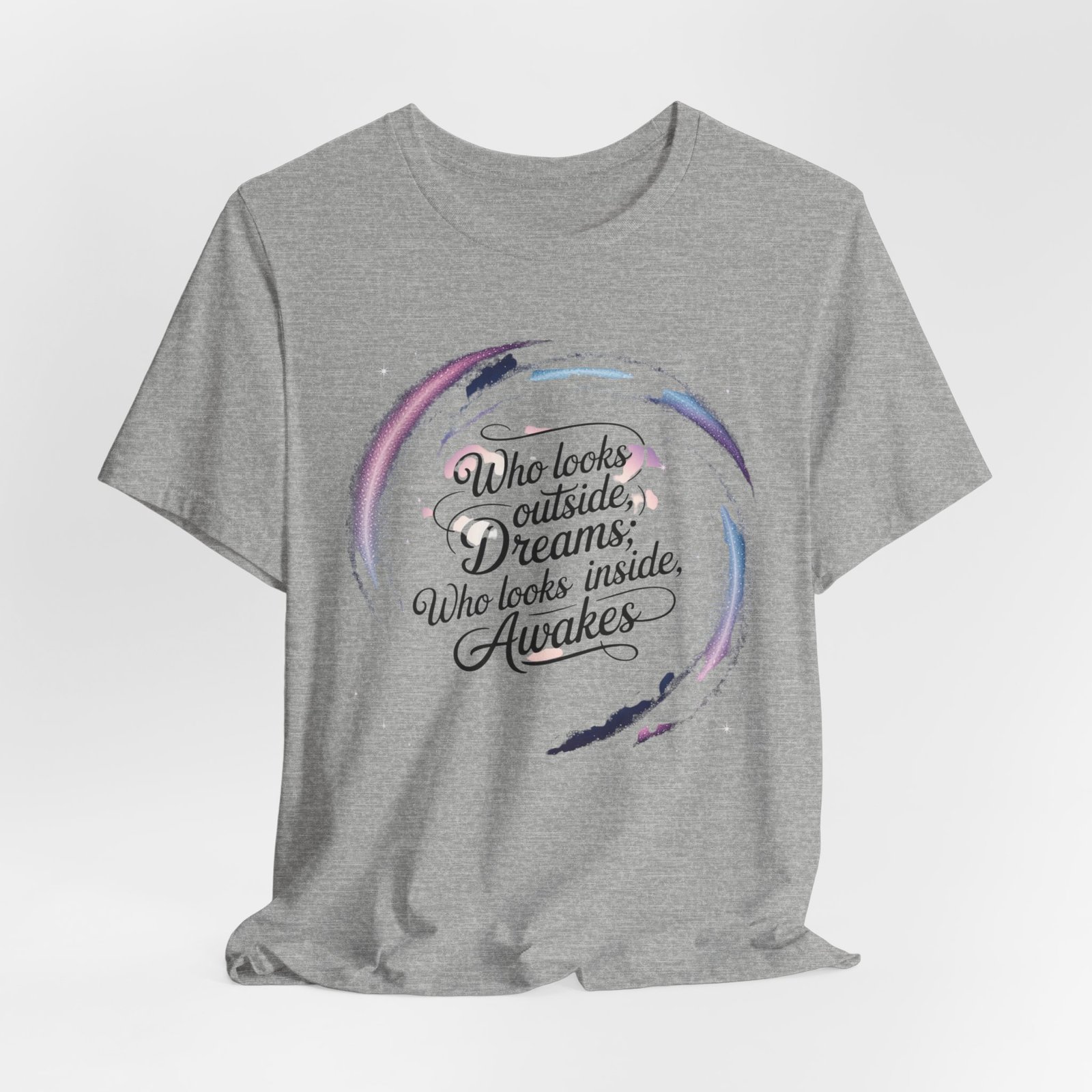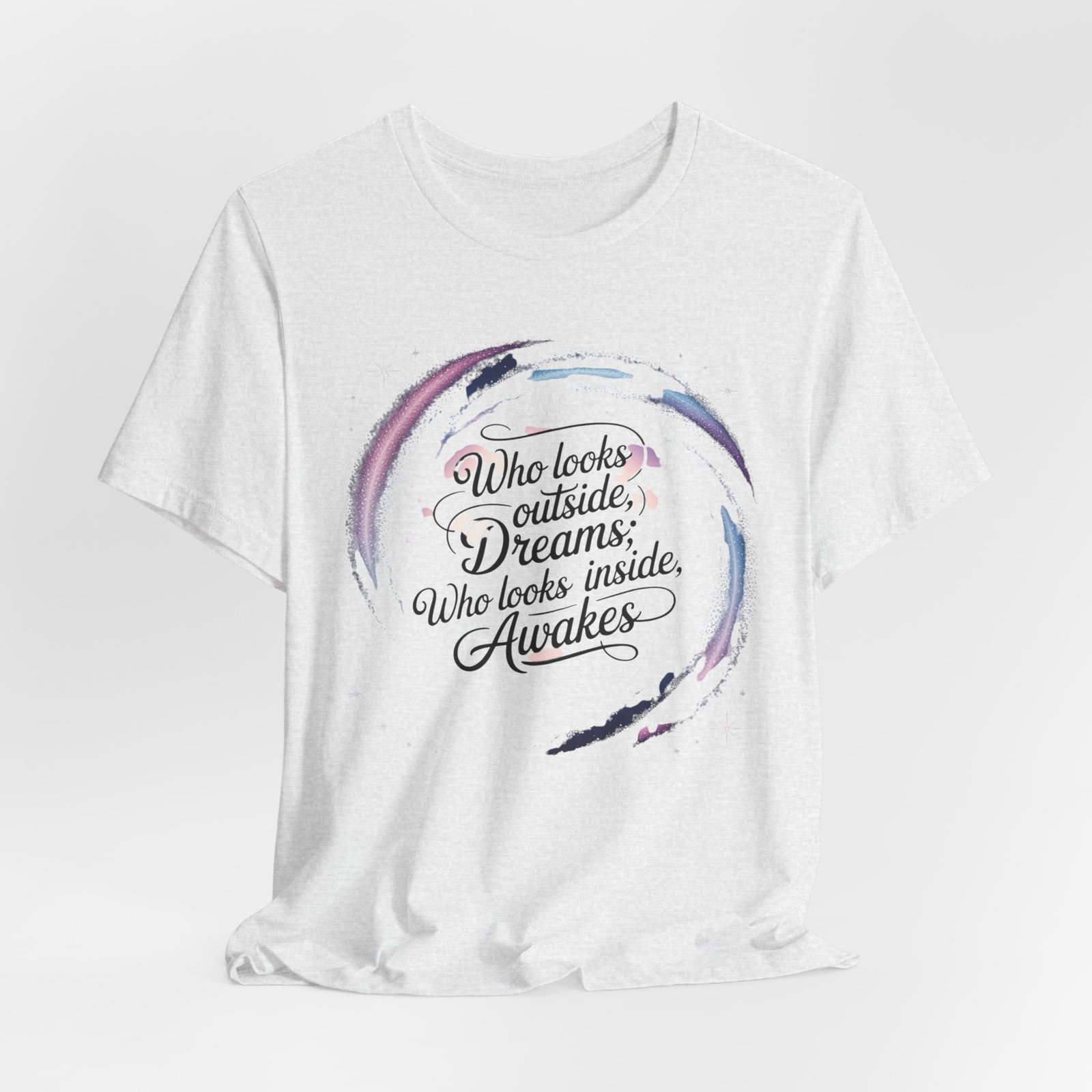 This lightweight jersey tee carries a quiet, thoughtful energy. A soft watercolor swirl frames a gentle hand-lettered message — Who looks outside dreams, Who looks inside awakens — inviting calm reflection. The breathable Airlume cotton and retail cut make it easy to wear layered on morning walks, at a cozy coffee shop table, or during late-night journaling sessions. It feels like a personal reminder slipped into your day: a subtle statement for people who value mindfulness, creativity, and quiet growth.
