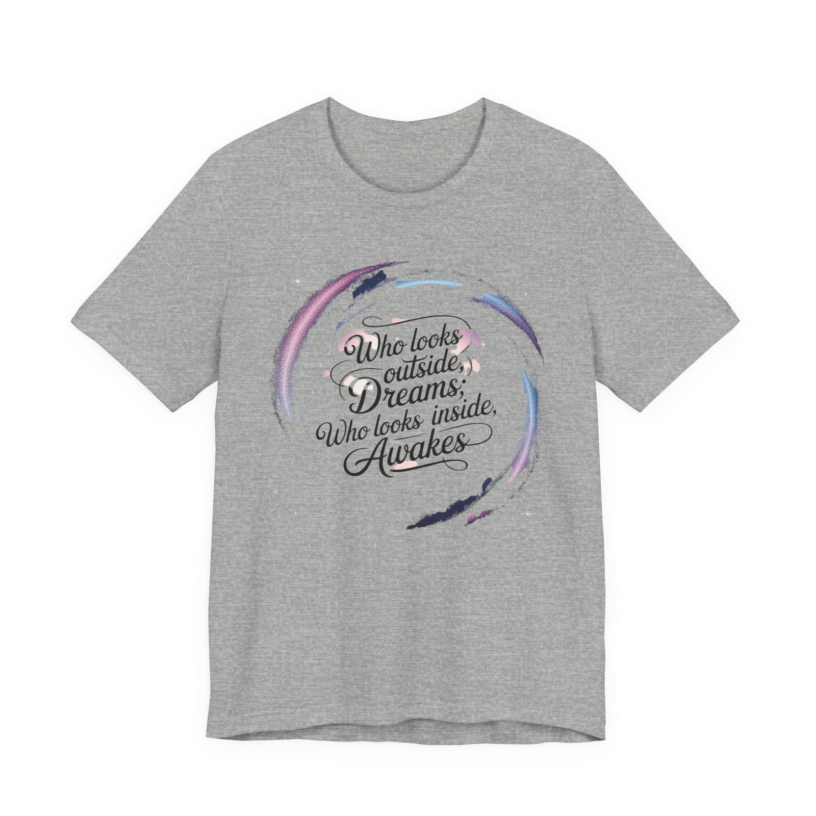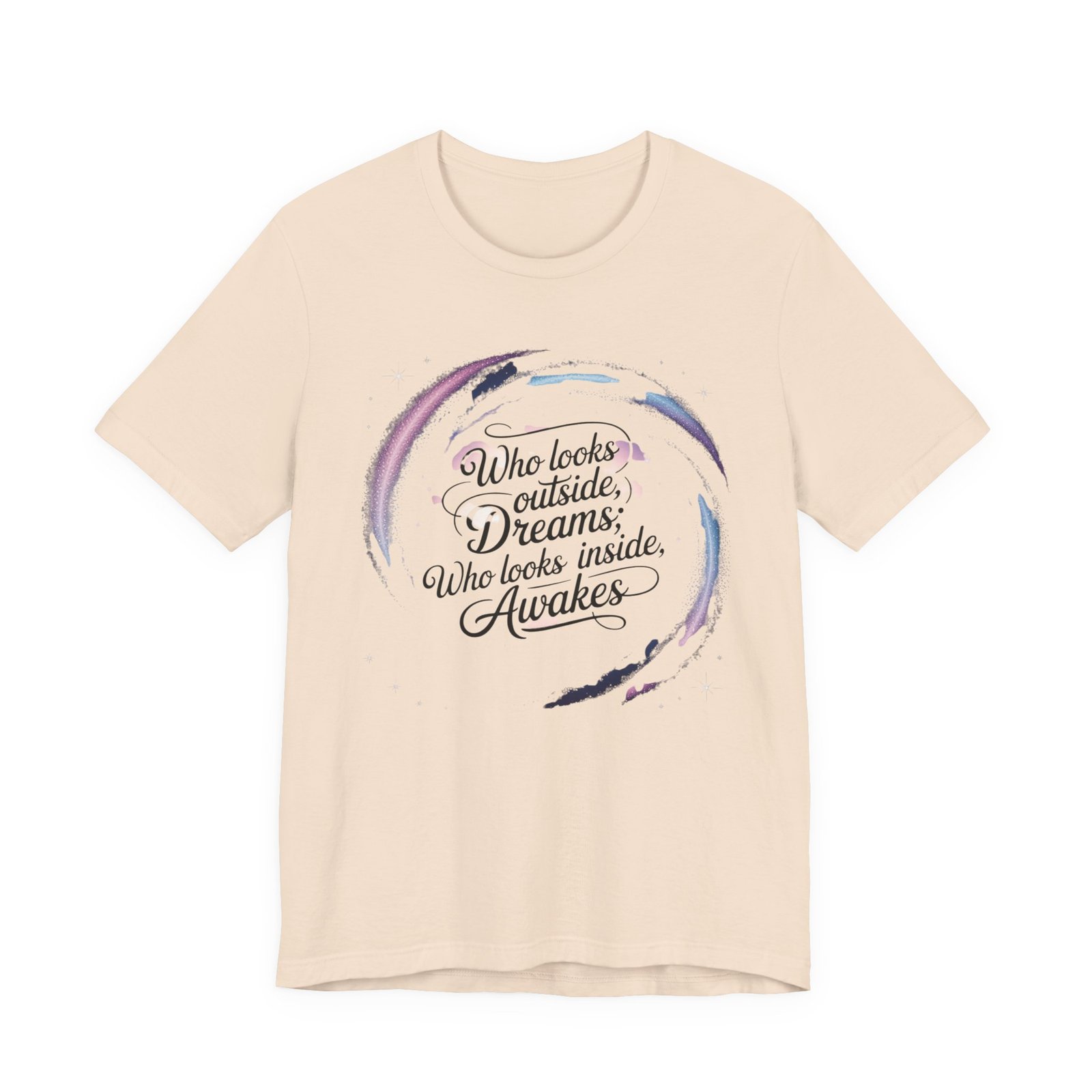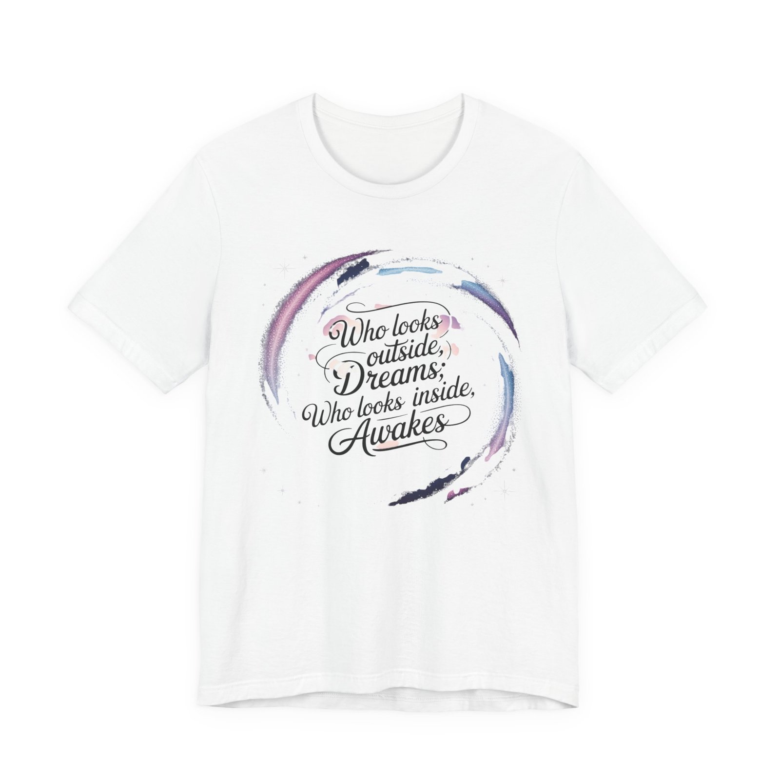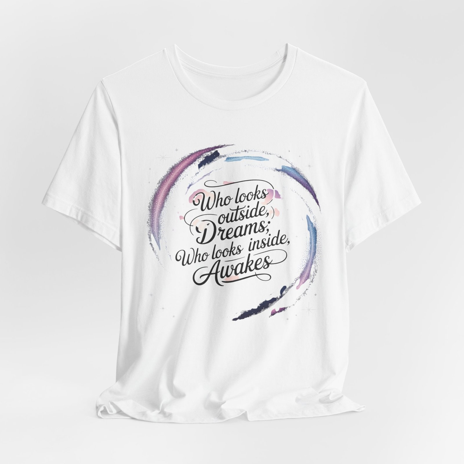 This lightweight jersey tee carries a quiet, thoughtful energy. A soft watercolor swirl frames a gentle hand-lettered message — Who looks outside dreams, Who looks inside awakens — inviting calm reflection. The breathable Airlume cotton and retail cut make it easy to wear layered on morning walks, at a cozy coffee shop table, or during late-night journaling sessions. It feels like a personal reminder slipped into your day: a subtle statement for people who value mindfulness, creativity, and quiet growth.