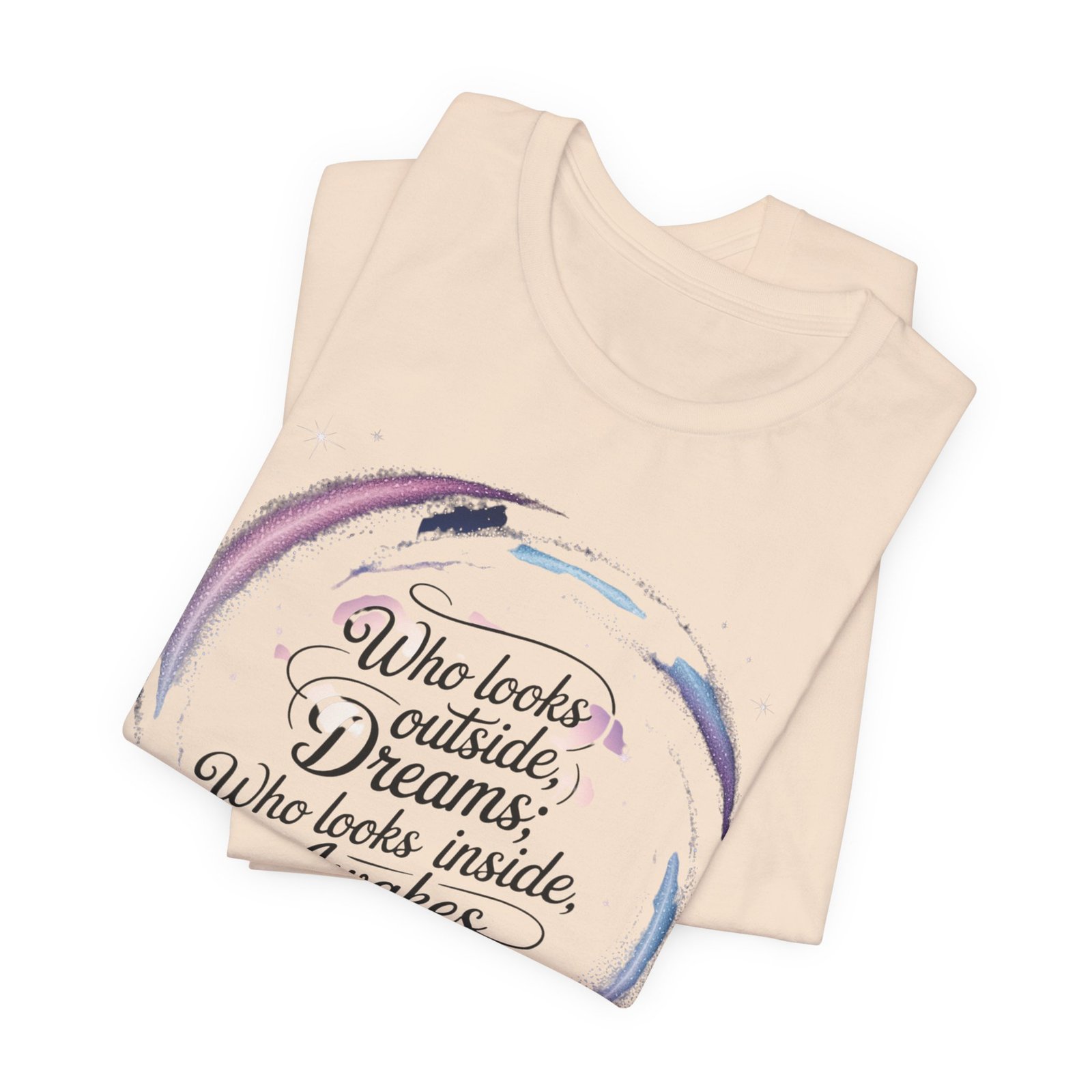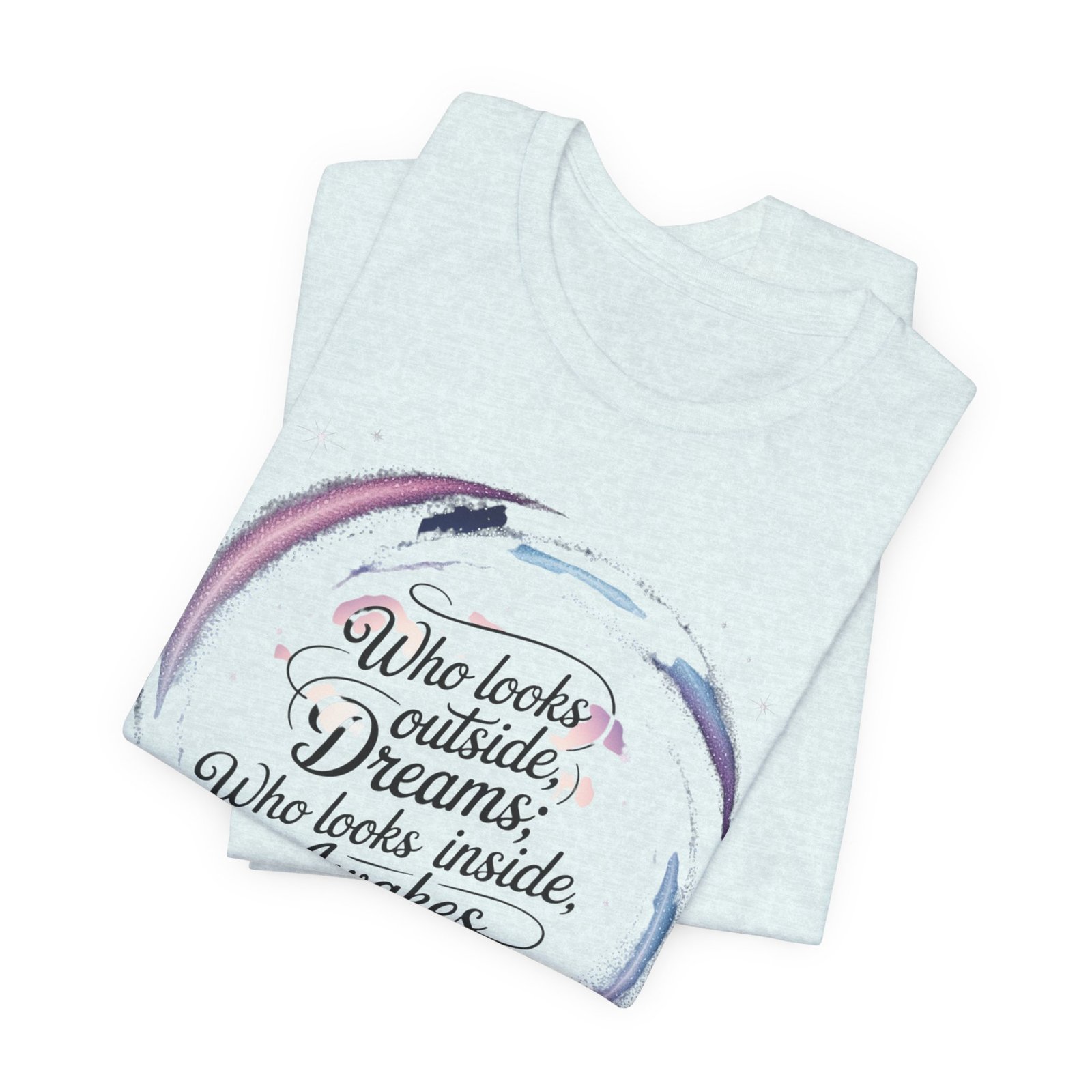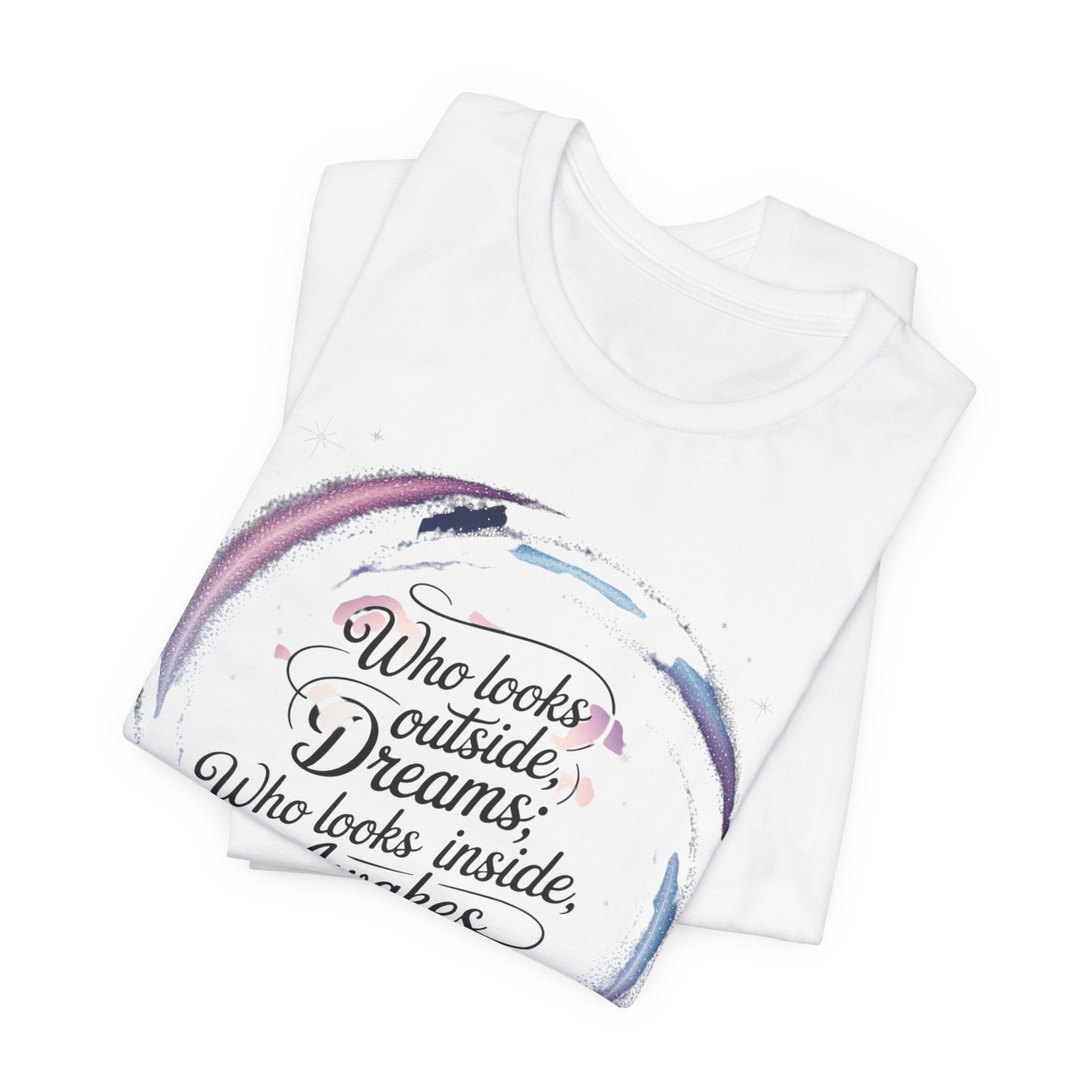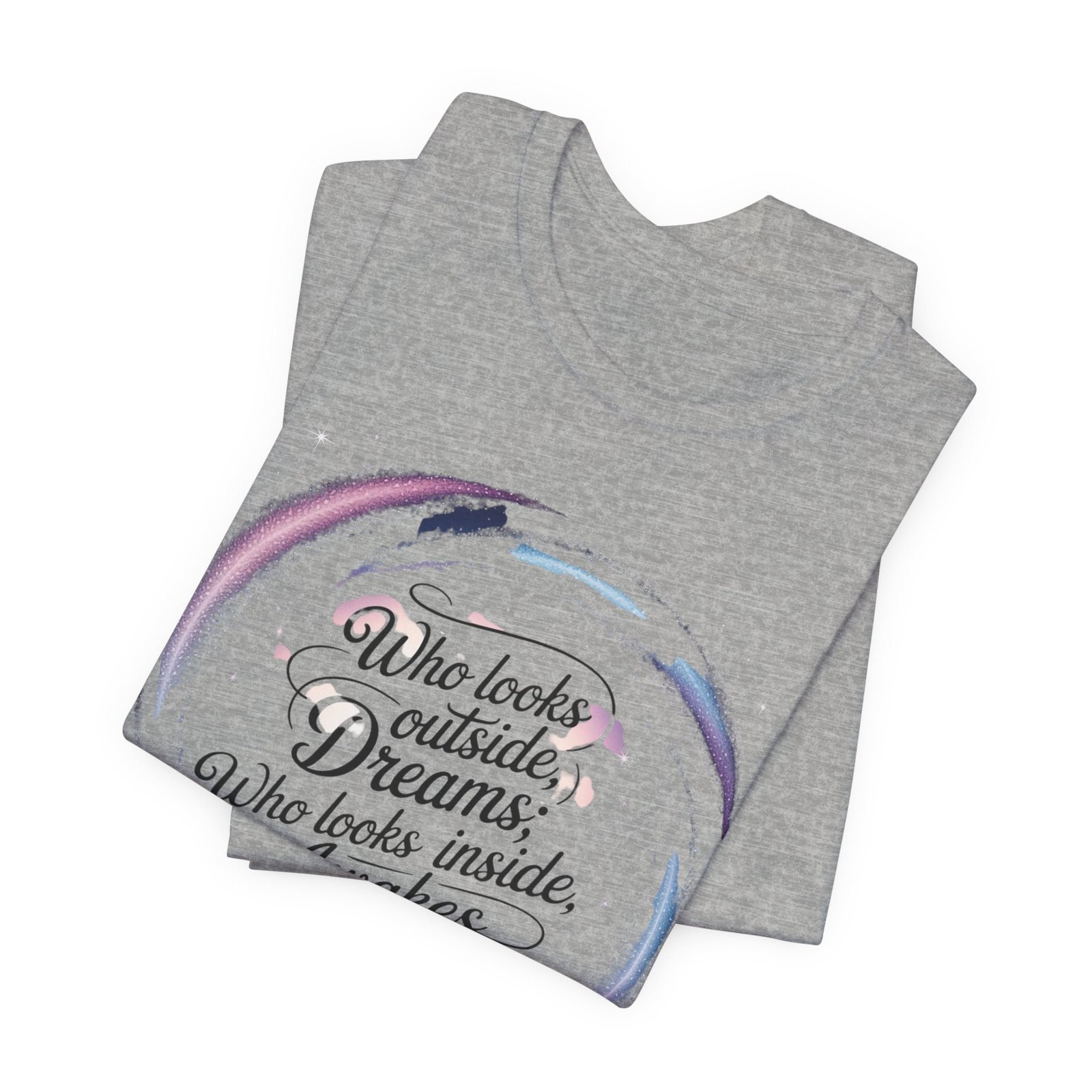 This lightweight jersey tee carries a quiet, thoughtful energy. A soft watercolor swirl frames a gentle hand-lettered message — Who looks outside dreams, Who looks inside awakens — inviting calm reflection. The breathable Airlume cotton and retail cut make it easy to wear layered on morning walks, at a cozy coffee shop table, or during late-night journaling sessions. It feels like a personal reminder slipped into your day: a subtle statement for people who value mindfulness, creativity, and quiet growth.