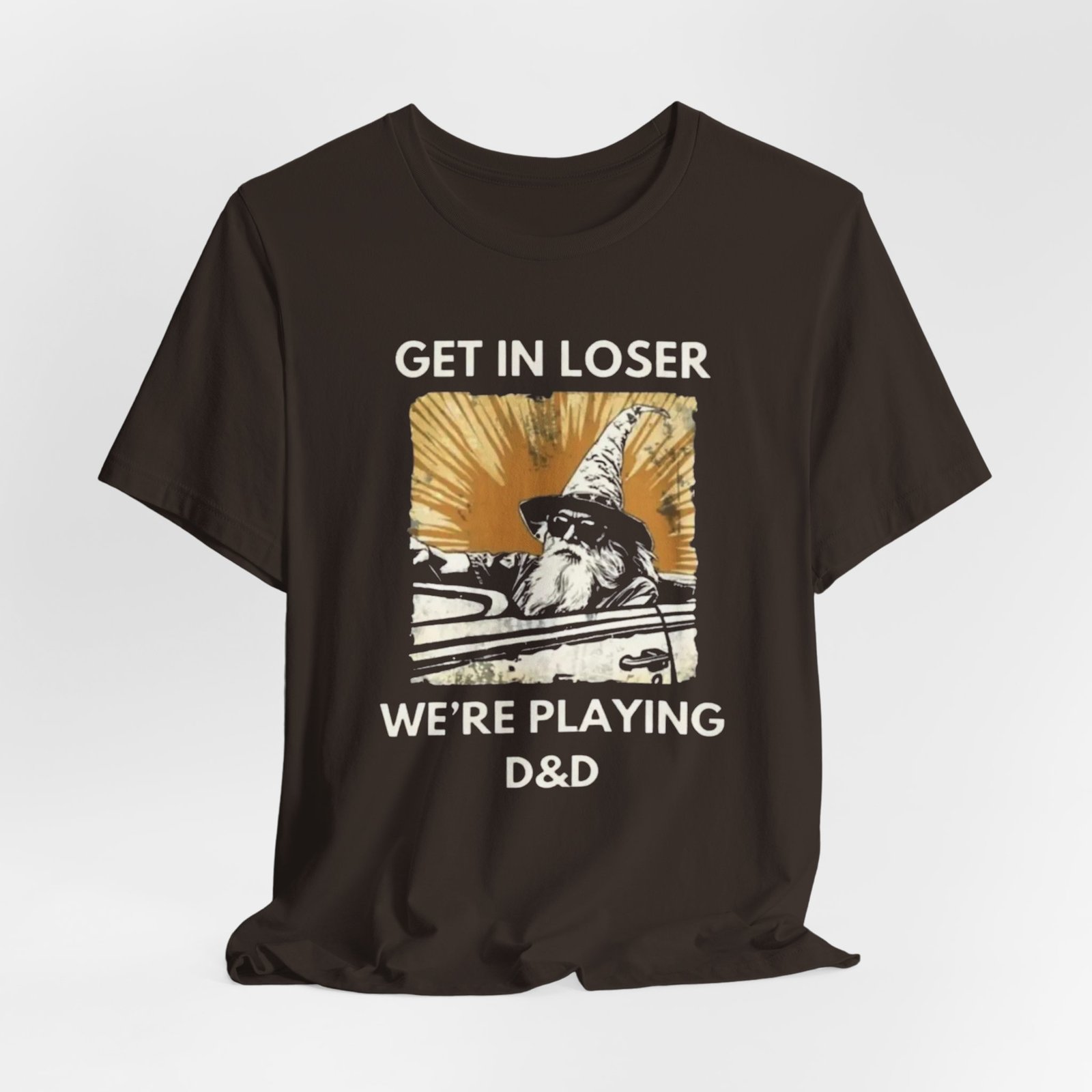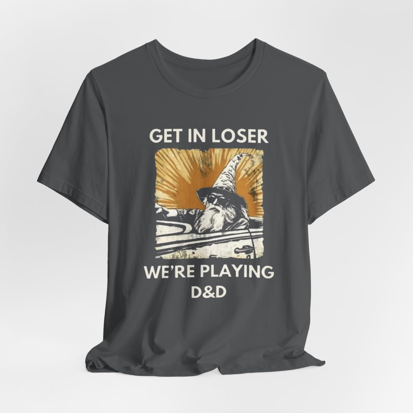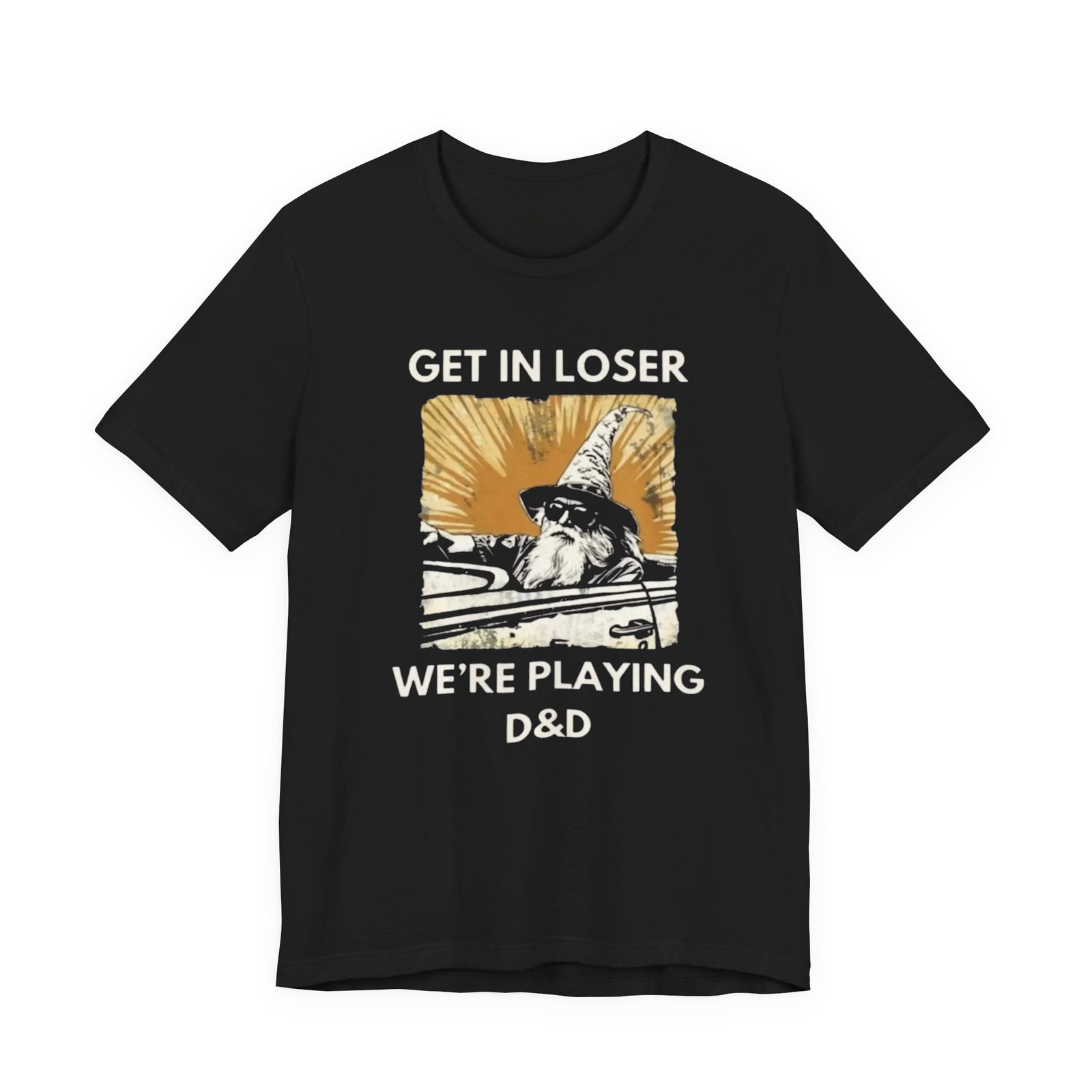 This lightweight jersey tee carries a playful, gamer-ready spirit — a worn, sunlit square print shows a cloaked figure mid-stride with the cheeky text hinting at a tabletop campaign: “Get in loser, we’re playing D&D.” Soft and breathable cotton keeps you cool during long sessions, while the slightly vintage, faded print reads like a page torn from a character journal. Wear it to game nights, conventions, or lazy weekends at the local café. It’s casual enough to layer under a hoodie and detailed enough to spark conversation with fellow players.