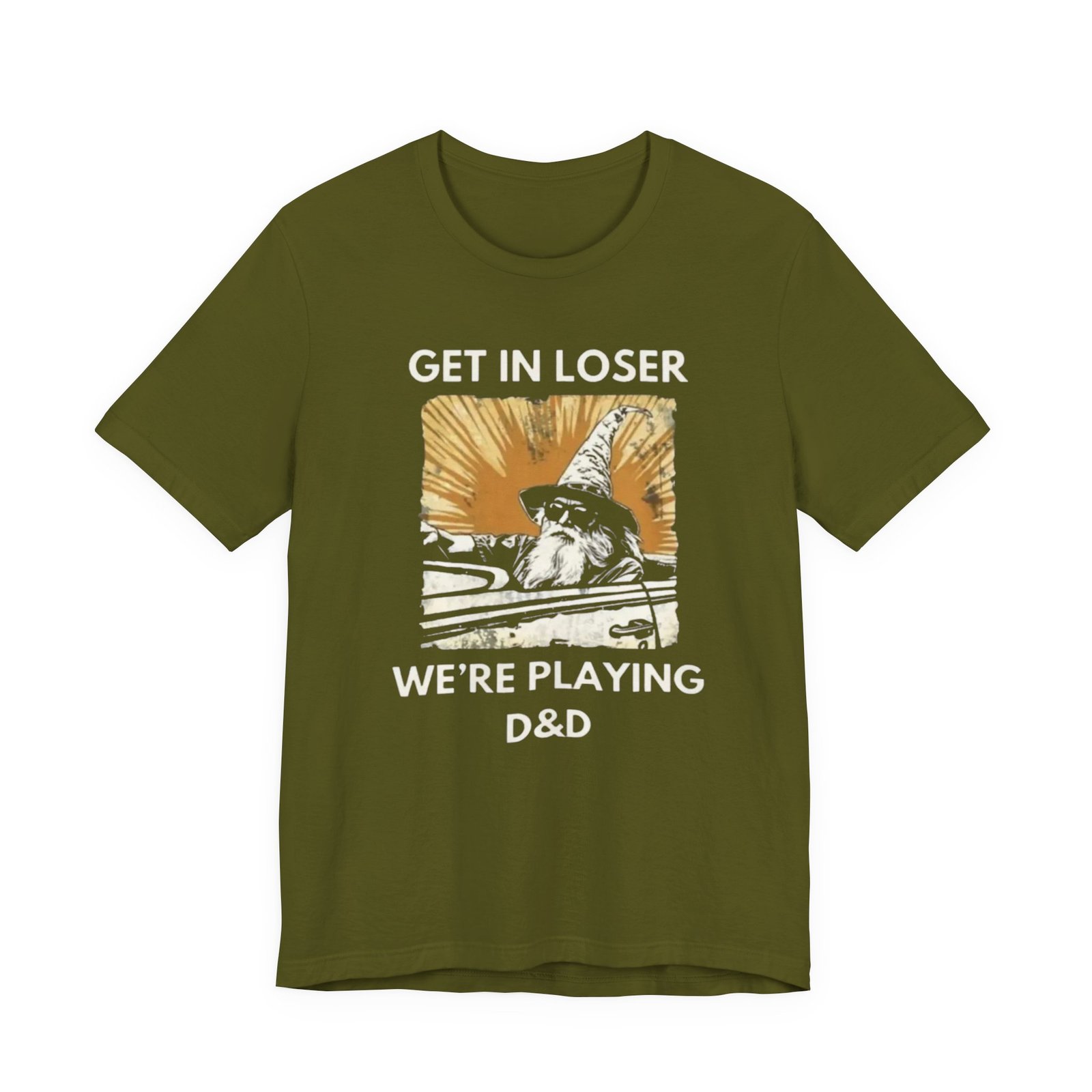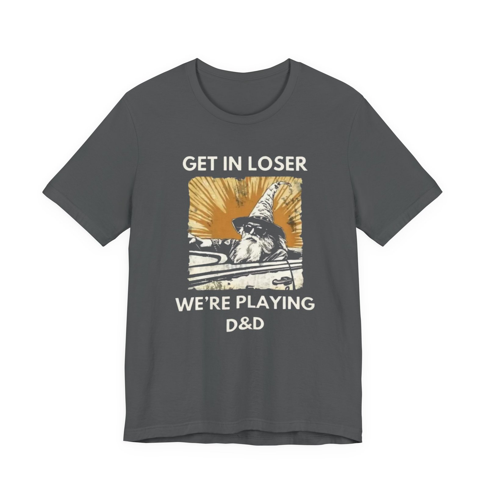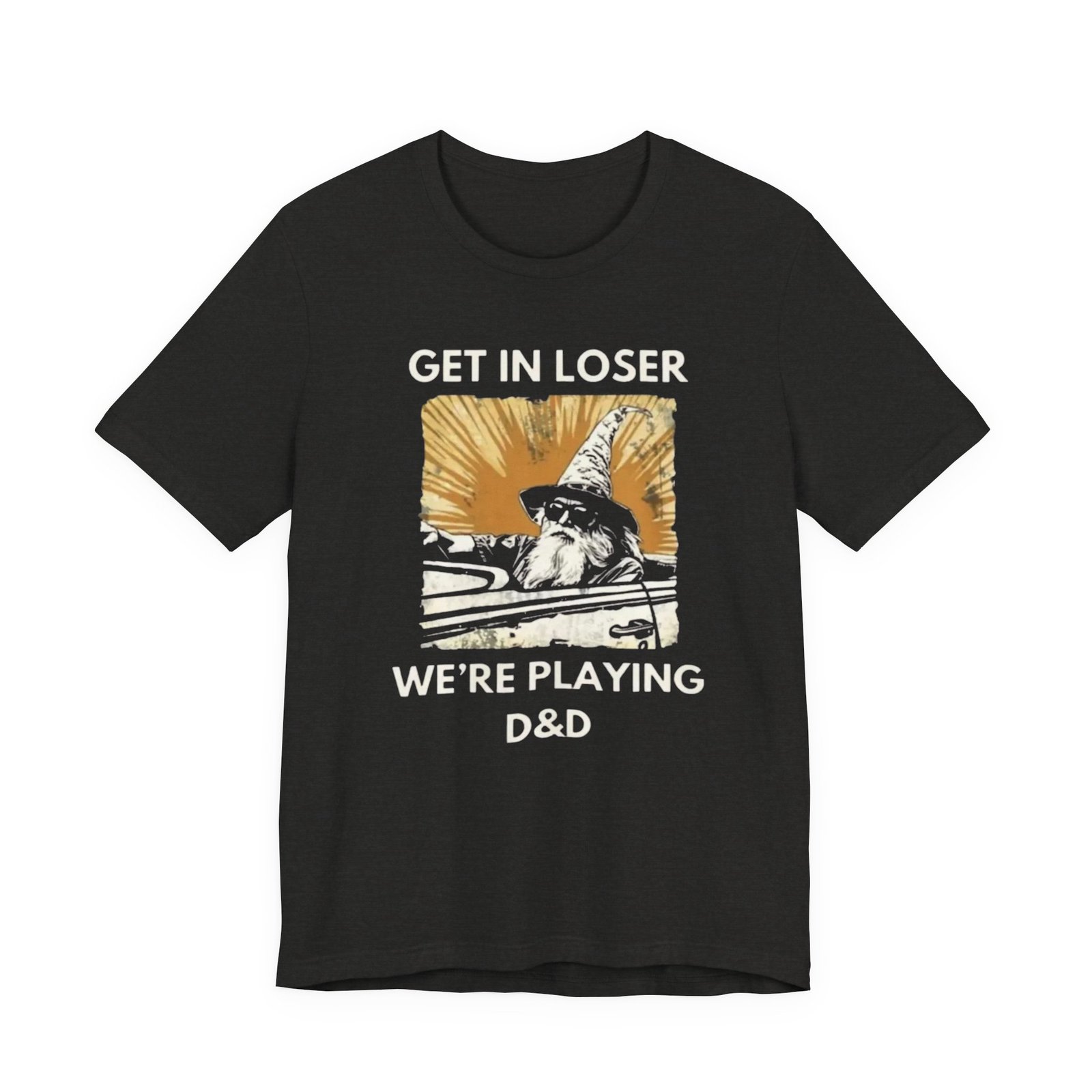 This lightweight jersey tee carries a playful, gamer-ready spirit — a worn, sunlit square print shows a cloaked figure mid-stride with the cheeky text hinting at a tabletop campaign: “Get in loser, we’re playing D&D.” Soft and breathable cotton keeps you cool during long sessions, while the slightly vintage, faded print reads like a page torn from a character journal. Wear it to game nights, conventions, or lazy weekends at the local café. It’s casual enough to layer under a hoodie and detailed enough to spark conversation with fellow players.
