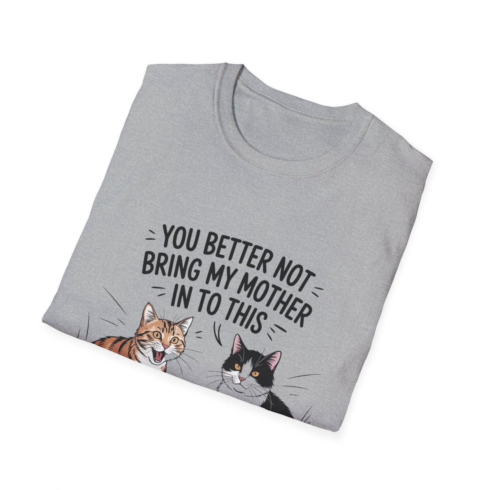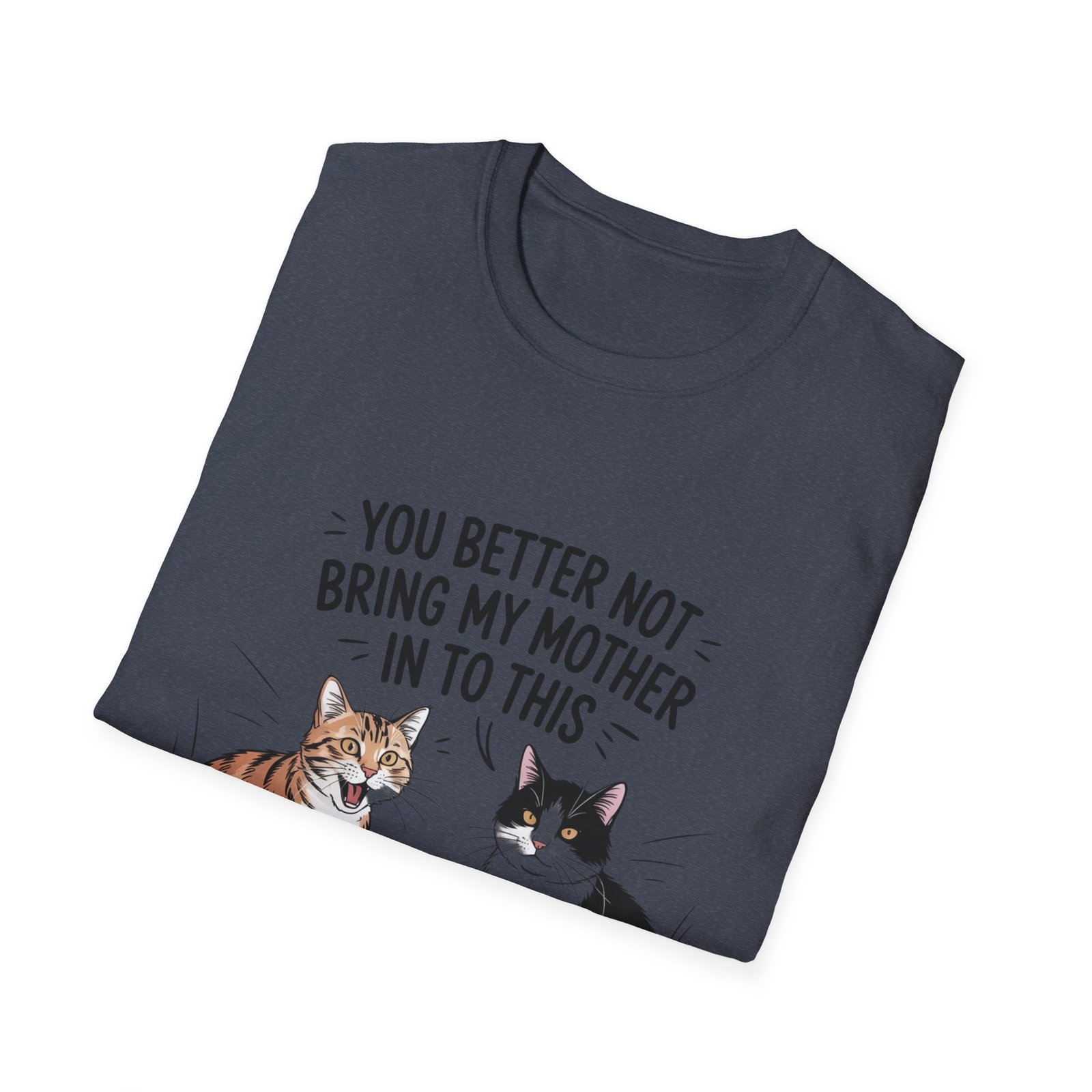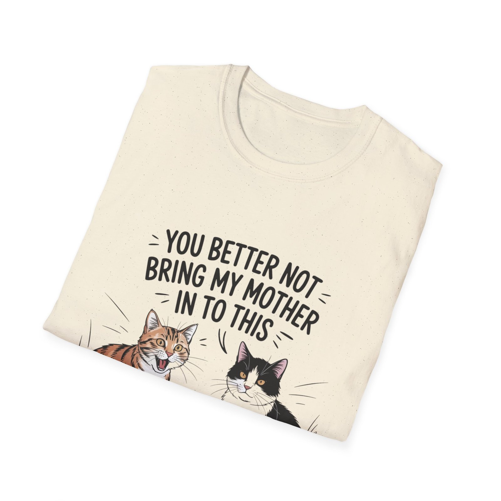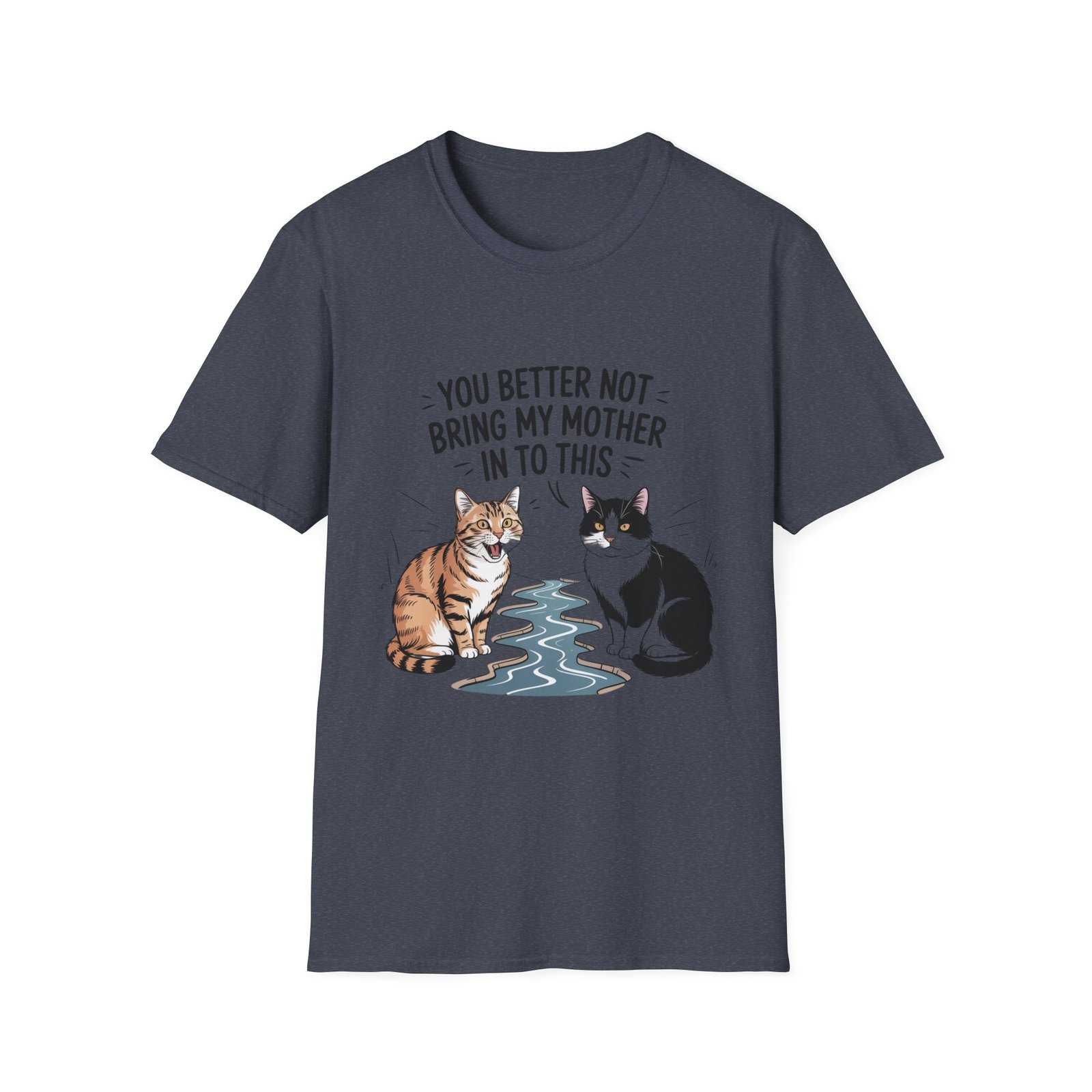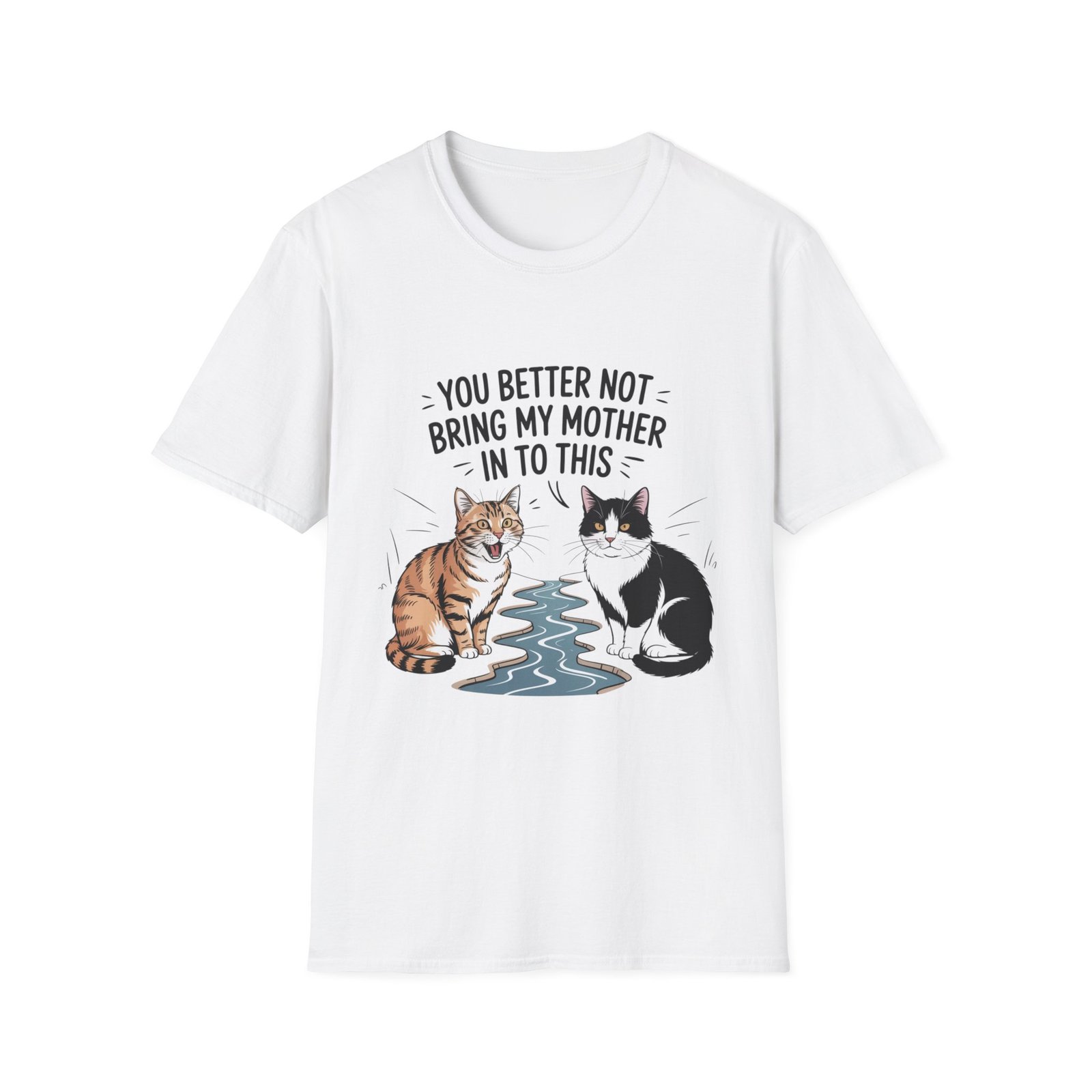 Soft, simple, and full of quiet humor — this lightweight tee pairs everyday comfort with a cheeky cat scene that feels like a whispered inside joke. Two illustrated cats face each other over a little squiggle of water, while hand-lettered text reads a playful warning: “You better not bring my mother in to this.” The fabric drapes smoothly and holds printed detail well, making the art pop without feeling stiff. Wear it around the house, to casual meetups, or on slow weekend errands when you want to share a smile without saying a word. It’s approachable, subtly funny, and made to be lived in.